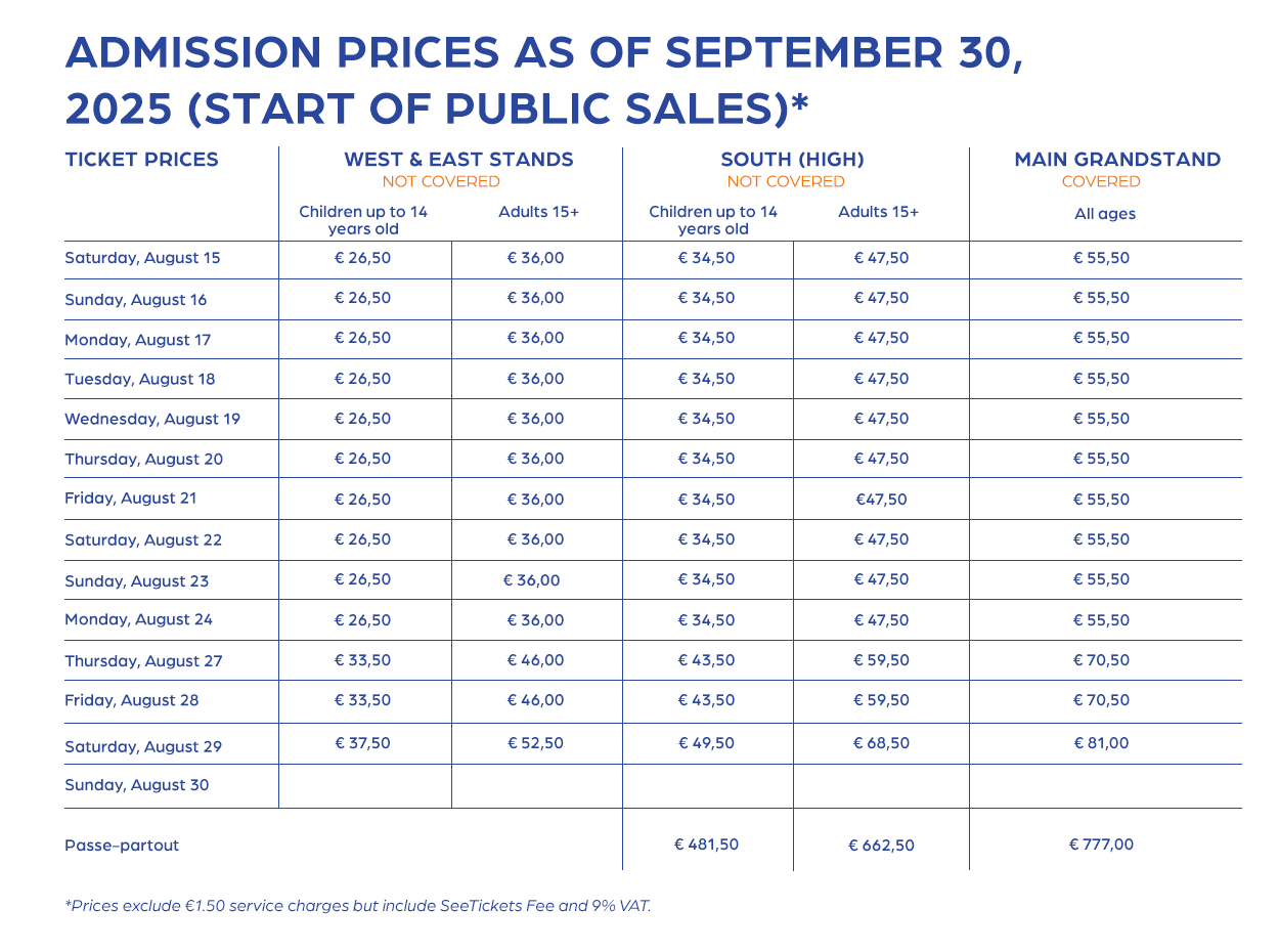 *For the main stand, youth prices do not apply. You can buy an adult ticket for children.